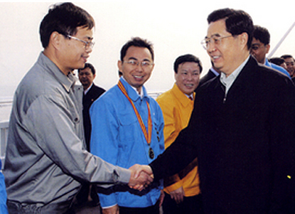 原中共中央總書記、國家主席、中央軍委主席胡錦濤2005年10月視察南京長江三橋建設(shè)并親切接見集團(tuán)公司干部職工。